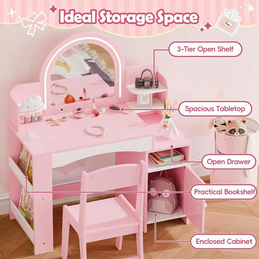 2-in-1 Kids Vanity Desk with LED Mirror & Bookshelf – Includes Chair