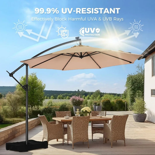 10ft LED Cantilever Patio Umbrella with Solar Lights & Base – Offset Hanging Outdoor Shade